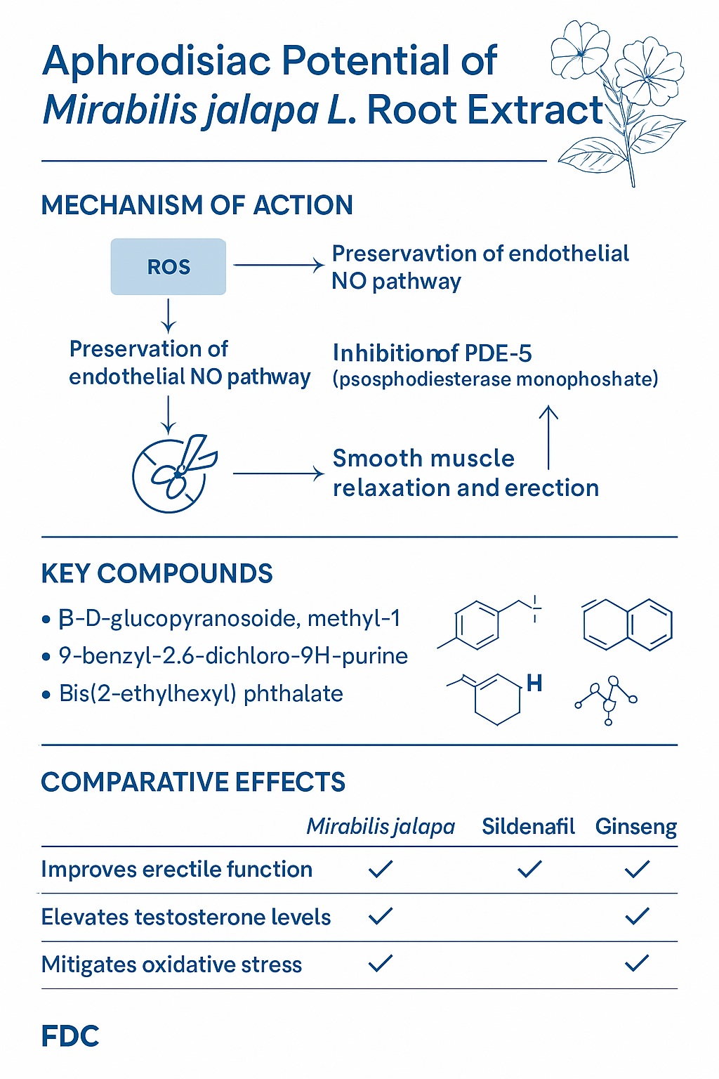 The story of Mirabilis jalapa L. encapsulates a profound truth: traditional medicine often identifies physiological truths long before modern biochemistry explains them. What was once a humble root powder for vitality is now a scientifically validated multi-mechanistic aphrodisiac capable of modulating PDE-5, hormonal pathways, and oxidative stress simultaneously.