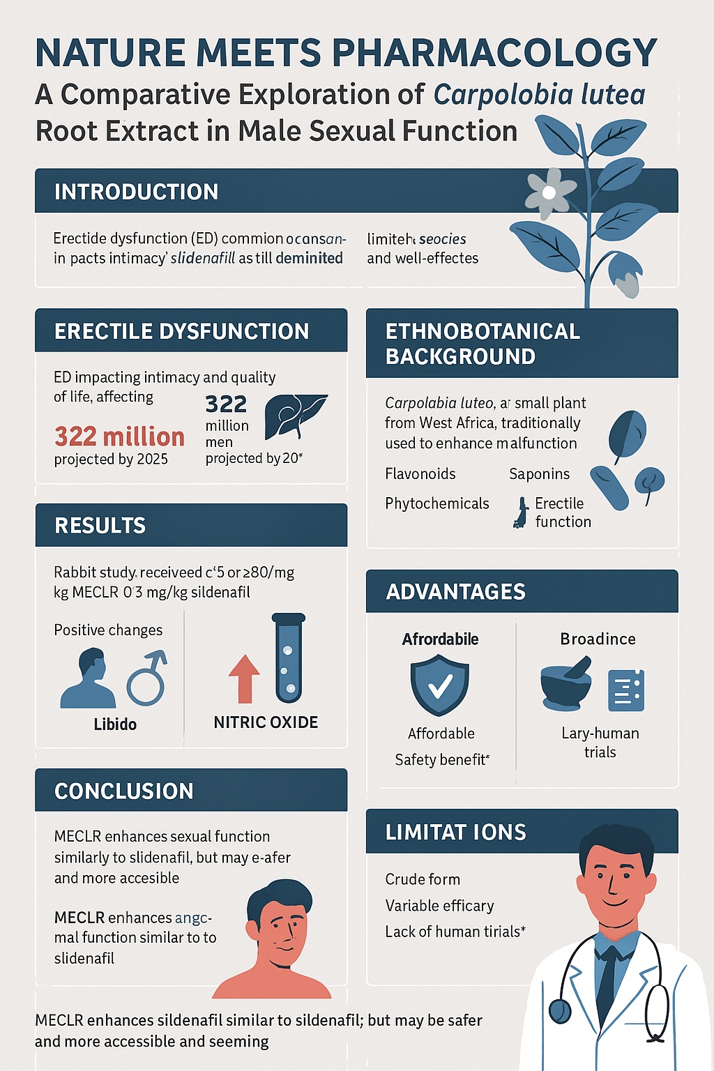 The comparative rabbit study provides compelling evidence that methanol extract of Carpolobia lutea root enhances male sexual activity in a manner strikingly similar to sildenafil. While it does not modulate testosterone, its ability to augment nitric oxide levels offers a plausible and powerful mechanism. The findings validate centuries of indigenous knowledge, reminding us that modern pharmacology and traditional medicine are not adversaries but collaborators.