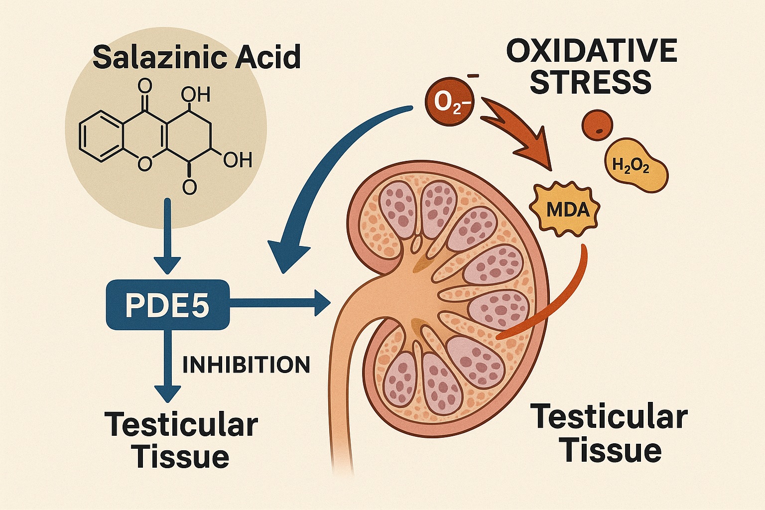 In this context, the scientific community has increasingly turned its gaze toward bioactive natural compounds capable of offering multifaceted protection—antioxidant, anti-inflammatory, and metabolic regulation—in addition to PDE5 inhibition. One such promising molecule is salazinic acid (Sa), a depsidone derivative abundantly present in lichen species such as Lobaria, Parmelia, and Usnea. The 2023 study by Killari et al. from Andhra University has illuminated the therapeutic potential of this compound, demonstrating its ability to restore sexual function, improve hormonal balance, and repair testicular tissue in diabetic rats.