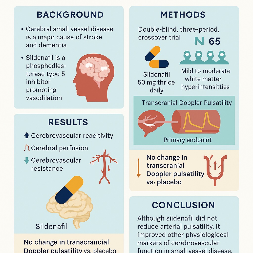 The OxHARP trial did not provide a dramatic breakthrough—pulsatility was unchanged—but it did offer something arguably more valuable: a robust signal that sildenafil improves cerebrovascular reactivity, perfusion, and resistance in patients with small vessel disease. These changes, achieved safely and with good tolerability, make sildenafil a compelling candidate for larger, longer trials aimed at preventing stroke and cognitive decline.