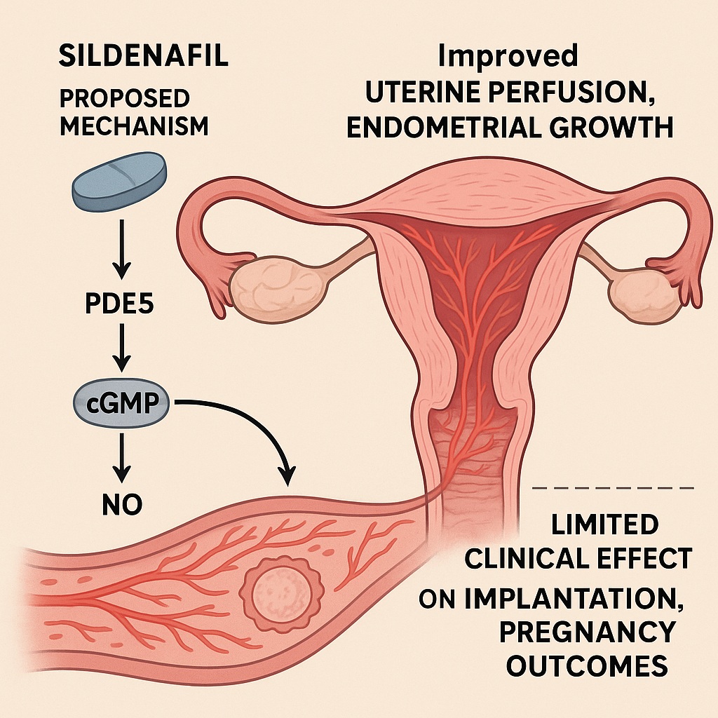 Sildenafil’s well-established pharmacology—phosphodiesterase type 5 (PDE5) inhibition—enhances nitric oxide (NO)–cyclic guanosine monophosphate (cGMP) signaling, promoting vasodilation and increased tissue perfusion. Theoretically, when applied to the uterus, this mechanism should enhance endometrial blood flow, cellular proliferation, and angiogenesis, leading to a thicker and more receptive lining. Early case reports and small pilot studies indeed hinted at improved outcomes, particularly in women with recalcitrant “thin endometrium.”