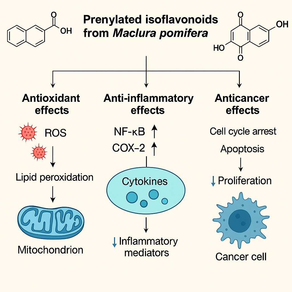 The recent study on Maclura pomifera extracts provides a comprehensive biochemical and pharmacodynamic analysis, elucidating their antioxidant, anti-inflammatory, antitumor, and antimicrobial activities. Beyond these, the study delves into the mechanistic depth of prenylated isoflavones, molecules whose structural diversity grants them exceptional biological versatility.