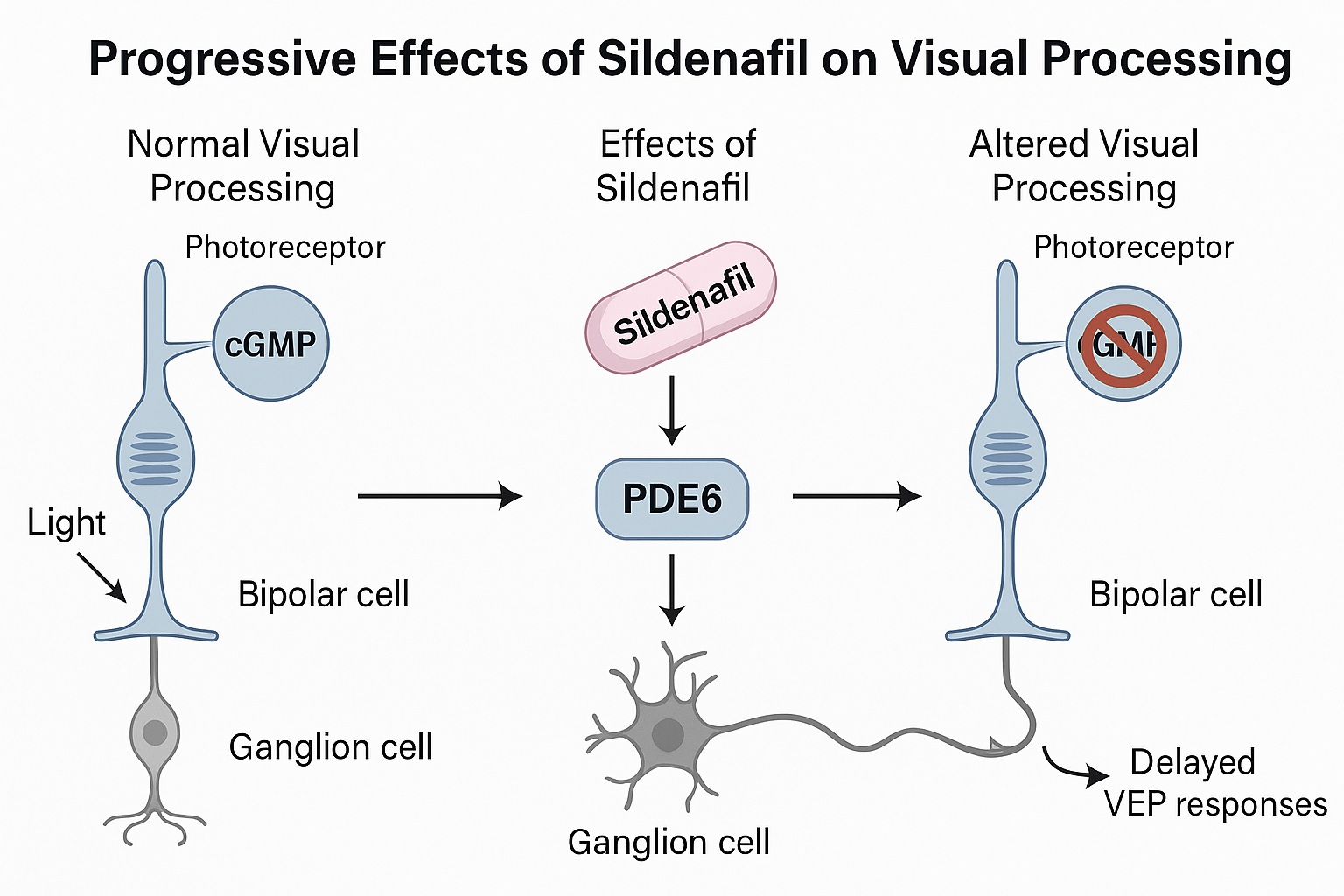 The retina, often described as an “outpost of the brain,” is exquisitely sensitive to metabolic and vascular fluctuations. Sildenafil’s dual action — elevating cGMP and modulating ocular blood flow — underscores the interconnectedness of biochemical and hemodynamic factors in vision. While PDE6 inhibition explains most electrophysiological disturbances, secondary effects such as transient intraocular pressure changes may also contribute.