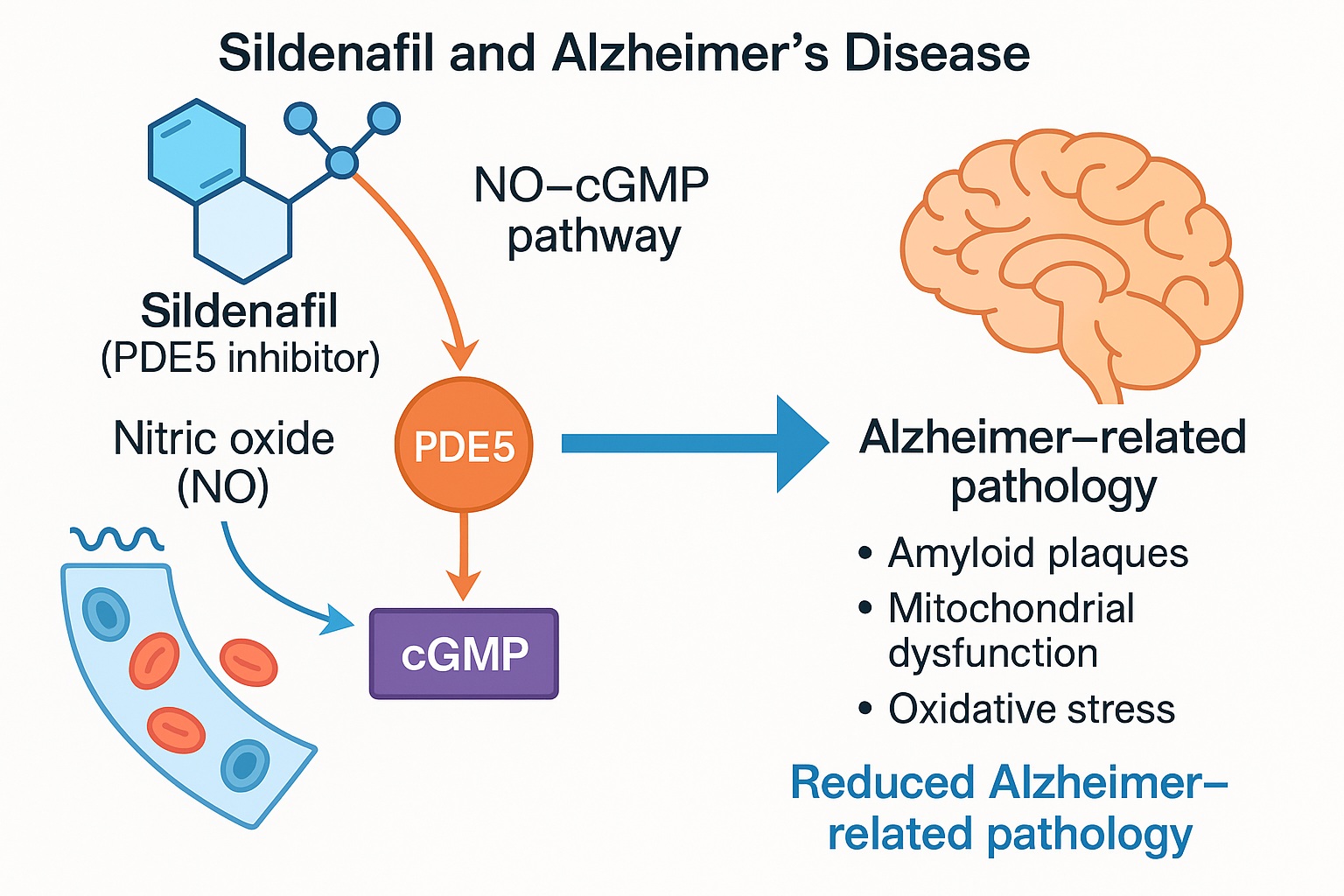 Sildenafil enhances nitric oxide–cGMP signaling, improving cerebral blood flow, reducing oxidative stress, and supporting mitochondrial and synaptic function. These effects may mitigate key processes involved in Alzheimer’s pathology, including amyloid accumulation and vascular dysfunction.